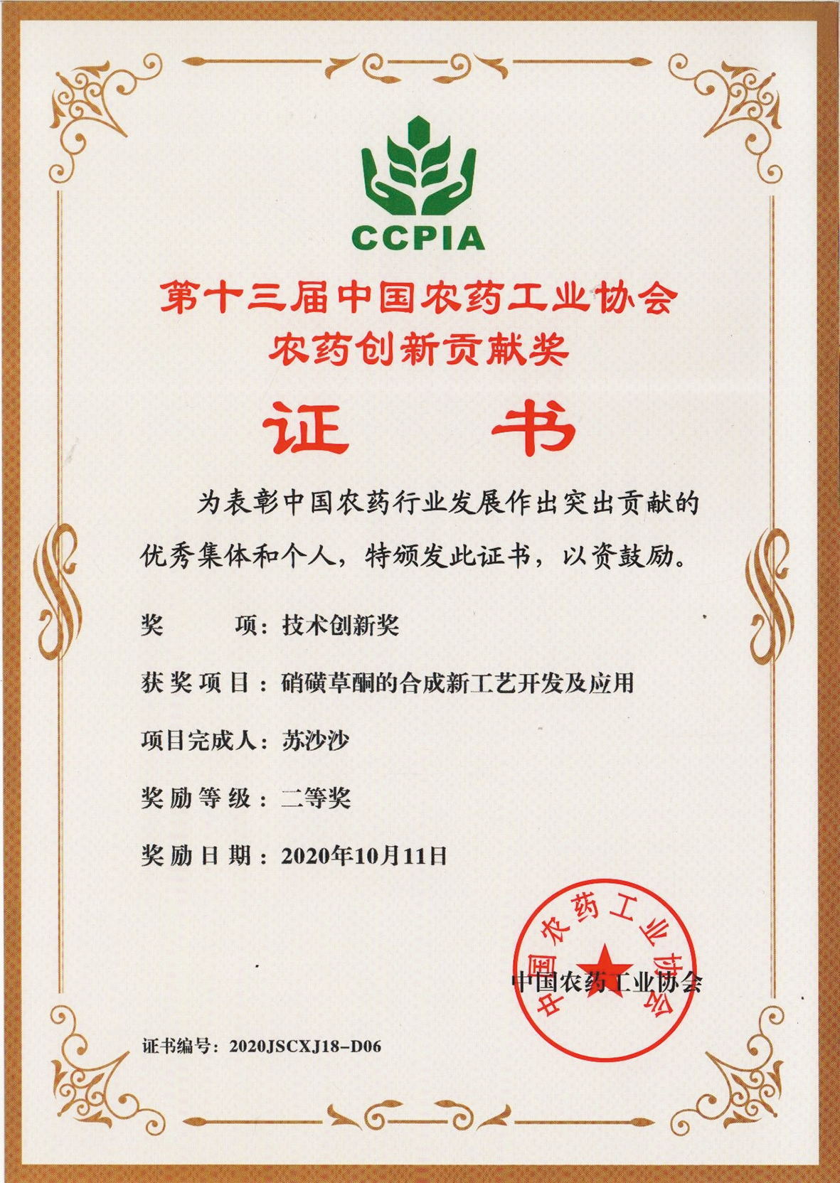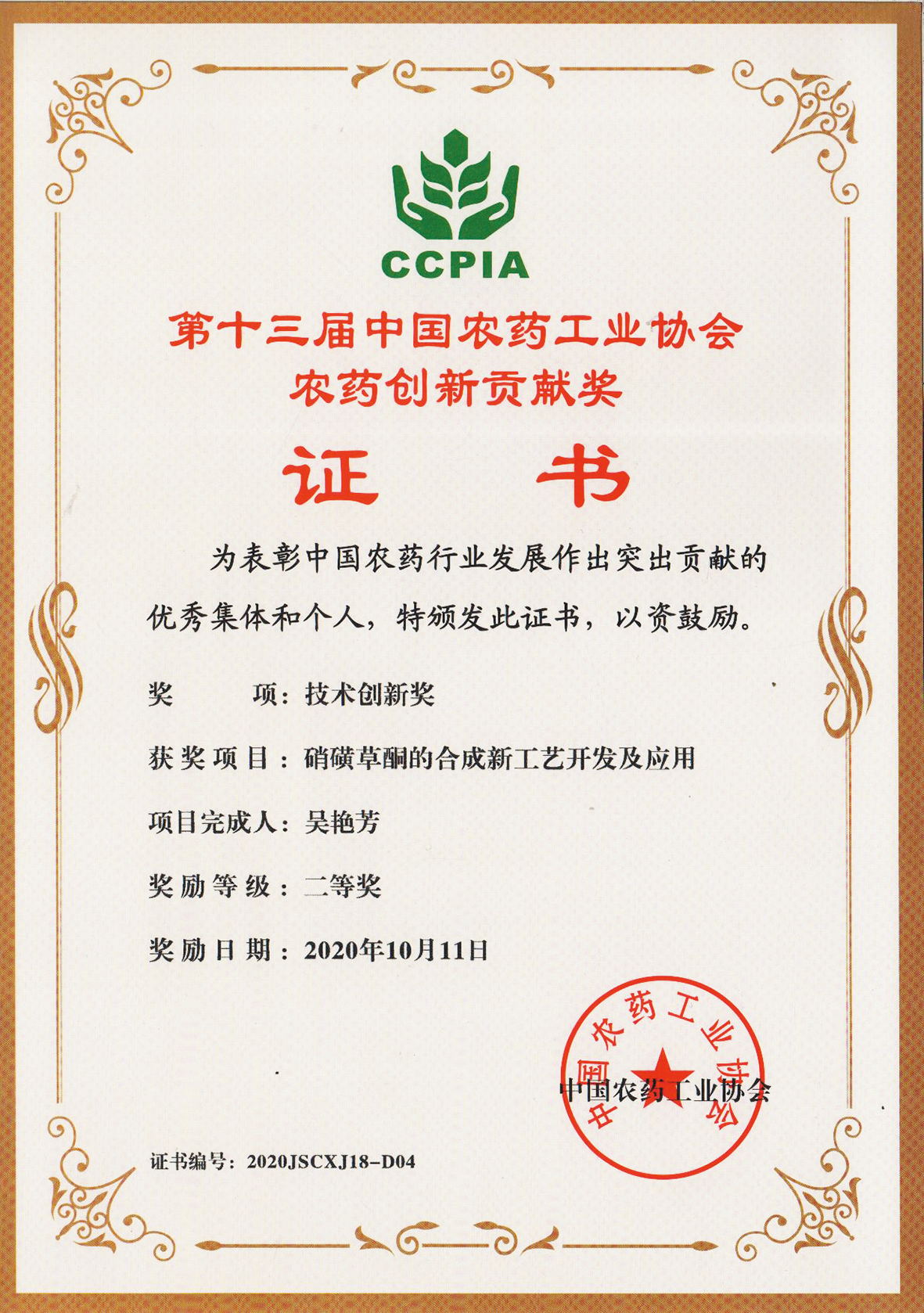 ■2020-11-15 2020-11-05 我公司“硝磺草酮的合成新工藝開發(fā)及應(yīng)用”項(xiàng)目榮獲技術(shù)創(chuàng)新獎(jiǎng)