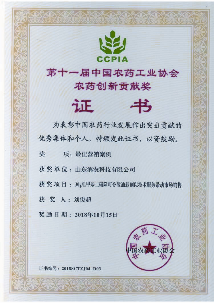 ■2018-10-15 我公司“30g/L甲基二磺隆可分散油懸劑以技術服務帶動市場銷售”榮獲“中國農
