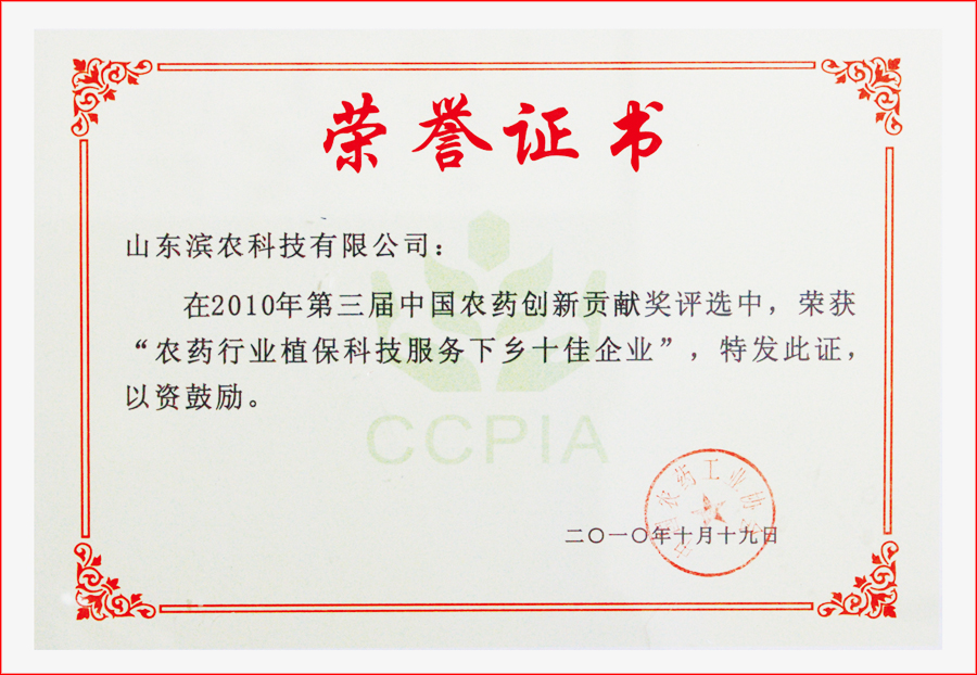 2010年10月20日,在上海召開的第十屆全國農(nóng)藥交流會(huì)開幕式上,第三屆“中國農(nóng)藥行業(yè)創(chuàng)新貢獻(xiàn)獎(jiǎng)”評(píng)選結(jié)果揭曉,我公司榮獲“中國農(nóng)藥行業(yè)植保科技服務(wù)下鄉(xiāng)十佳企業(yè)”稱號(hào),董事長黃延昌出席頒獎(jiǎng)儀式。 據(jù)悉,“中國農(nóng)藥行業(yè)創(chuàng)新貢獻(xiàn)獎(jiǎng)”自2008年創(chuàng)立并開展評(píng)選活動(dòng)以來,在調(diào)動(dòng)全國農(nóng)藥行業(yè)工作者的積極性和創(chuàng)造性、加速我國農(nóng)藥事業(yè)發(fā)展方面起到了積極的推動(dòng)作用。本屆評(píng)選側(cè)重于在責(zé)任關(guān)懷、誠信經(jīng)營及植保科技服務(wù)下鄉(xiāng)三個(gè)方面做出突出成績的企業(yè),設(shè)立了“農(nóng)藥行業(yè)責(zé)任關(guān)懷十佳企業(yè)”、“農(nóng)藥行業(yè)出口貿(mào)易誠信十佳企業(yè)”、“農(nóng)藥行業(yè)植??萍挤?wù)下鄉(xiāng)十佳企業(yè)”三大獎(jiǎng)項(xiàng)。由工信部、農(nóng)業(yè)部、中國農(nóng)業(yè)生產(chǎn)資料流通協(xié)會(huì)、植保(中國)協(xié)會(huì)、中國出口信用保險(xiǎn)公司等單位從事農(nóng)藥管理和服務(wù)的專家組成的評(píng)選專家組,對(duì)申報(bào)企業(yè)經(jīng)過初評(píng)和終評(píng),最終評(píng)選出30家獲獎(jiǎng)企業(yè)。 ![]() |