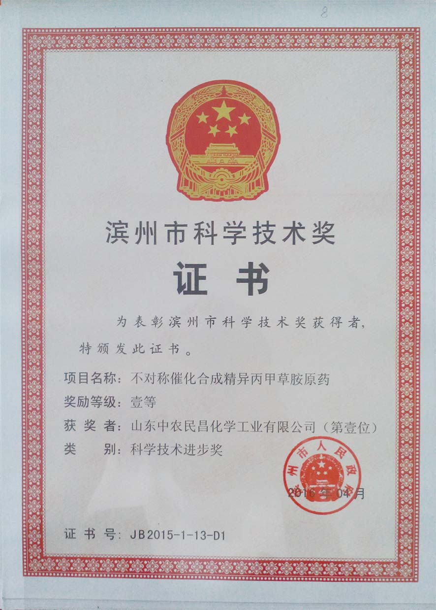 我公司三項(xiàng)目榮獲濱州市科學(xué)技術(shù)進(jìn)步獎(jiǎng)發(fā)布時(shí)間:2016-07-07 08:47本報(bào)訊 5月27日,濱州市市政府隆重召開全市科學(xué)技術(shù)獎(jiǎng)勵(lì)大會(huì),表彰獎(jiǎng)勵(lì)為全市科技事業(yè)做出突出貢獻(xiàn)的單位和科技工作者,我公司總工程師徐家俊參加了會(huì)議。 山東中農(nóng)民昌化學(xué)工業(yè)有限公司“不對稱催化合成精異丙甲草胺原藥”和“磺草酮·莠去津懸浮劑的開發(fā)及產(chǎn)業(yè)化”項(xiàng)目分別獲得濱州市科學(xué)技術(shù)進(jìn)步獎(jiǎng)一等獎(jiǎng)和三等獎(jiǎng),山東濱農(nóng)科技有限公司“新型油菜田除草劑二氯吡啶酸·烯草酮WP的開發(fā)研制”項(xiàng)目獲得濱州市科學(xué)技術(shù)進(jìn)步獎(jiǎng)三等獎(jiǎng)。