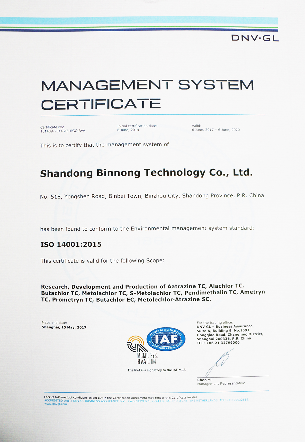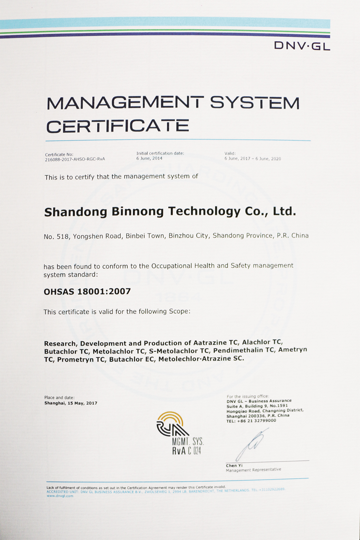 我公司順利通過(guò)質(zhì)量、環(huán)境和職業(yè)健康安全管理體系再認(rèn)證審核發(fā)布時(shí)間:2017-07-11 15:53本報(bào)訊 3月27-30日,DNV·GL審核組來(lái)我公司對(duì)2017年質(zhì)量、環(huán)境和職業(yè)健康安全管理體系進(jìn)行再認(rèn)證審核。 各車間、部門積極配合,30個(gè)不符合項(xiàng)和2個(gè)觀察項(xiàng)按照預(yù)定時(shí)間5月6日前均已整改完成并提交DNV·GL審核組,審核組對(duì)提交的文件數(shù)據(jù)進(jìn)行了認(rèn)真評(píng)審,并反饋關(guān)閉所有不符合項(xiàng)和觀察項(xiàng),給予推薦換發(fā)證書。 6月6日,我公司啟用新版ISO9001︰2015、ISO1414001︰2015和OHSAS18001︰2007管理體系標(biāo)準(zhǔn)證書。證書范圍覆蓋“莠去津原藥、甲草胺原藥、丁草胺原藥、異丙甲草胺原藥、S-異丙甲草胺原藥、二甲戊樂(lè)靈原藥、莠滅凈原藥、撲草凈原藥、丁草胺乳油、異丙草·莠懸浮劑”等10個(gè)產(chǎn)品。