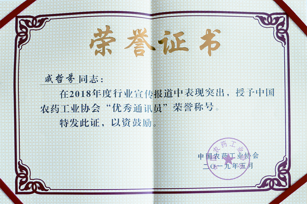 我公司戚哲芬榮獲中國農藥工業(yè)協(xié)會“優(yōu)秀通訊員”榮譽稱號