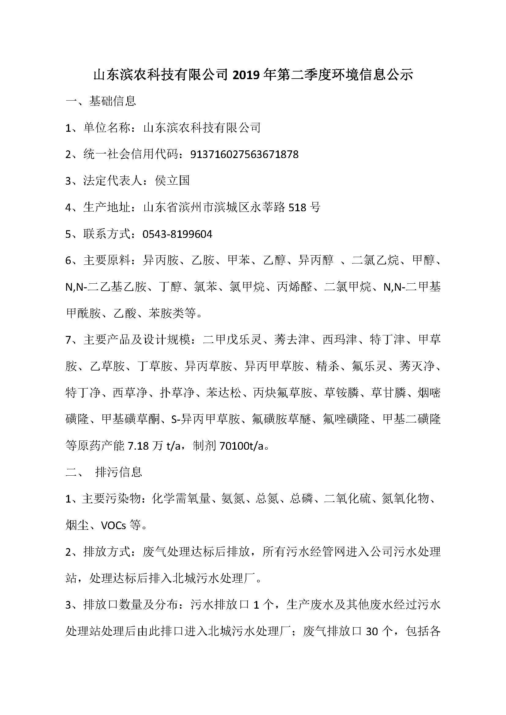 山東濱農科技有限公司2019年第二季度環(huán)境信息公示