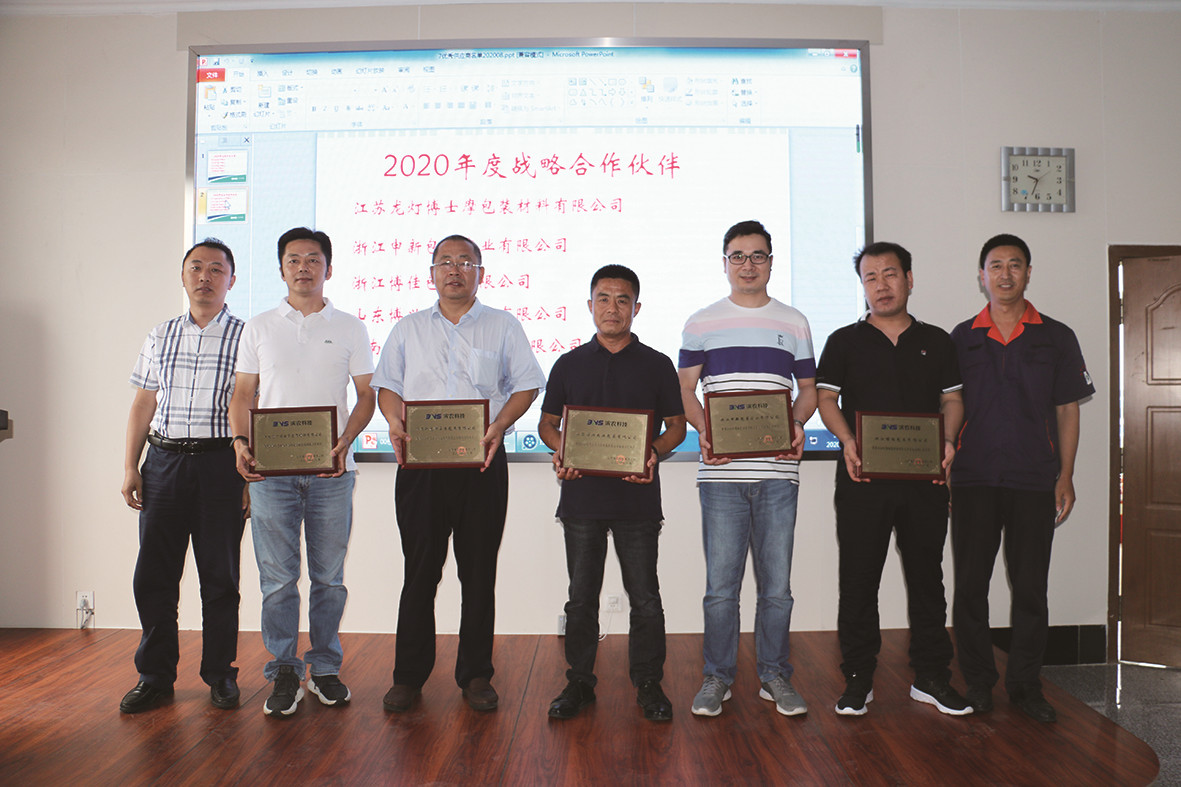 首先,張強(qiáng)結(jié)合我公司上一年度的整體生產(chǎn)經(jīng)營(yíng)情況,就2020年度生產(chǎn)和市場(chǎng)上反饋的包裝物質(zhì)量問題與大家進(jìn)行了交流并就解決方案進(jìn)行了協(xié)商,隨后宣布了今年的優(yōu)秀供應(yīng)商名單并現(xiàn)場(chǎng)頒獎(jiǎng)合影留念。2020年度戰(zhàn)略合作伙伴為:江蘇龍燈博士摩包裝材料有限公司、浙江申新包裝實(shí)業(yè)有限公司、浙江博佳包裝有限公司、山東博興大業(yè)包裝有限公司、濟(jì)南新先鋒至尊包裝有限公司;2020年度優(yōu)秀供應(yīng)商為:濱州魯達(dá)包裝有限公司、山東睿豐包裝有限公司、山東葉華包裝有限公司、格瑞夫包裝有限公司、臨淄振芳包裝有限公司。