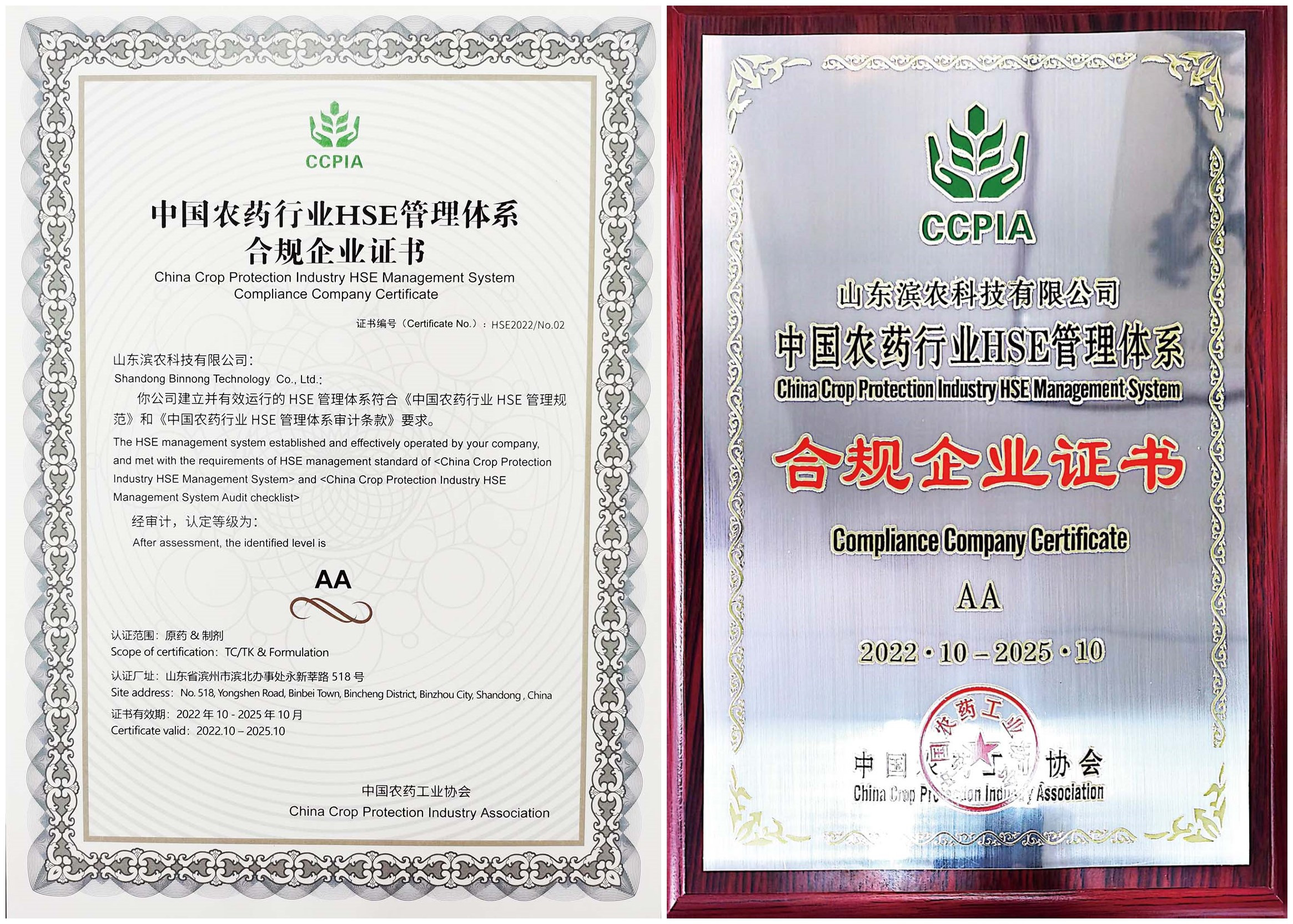 濱農(nóng)科技通過 “中國農(nóng)藥行業(yè)HSE管理體系合規(guī)企業(yè)”認證復(fù)審發(fā)布時間:2023-04-20 15:32