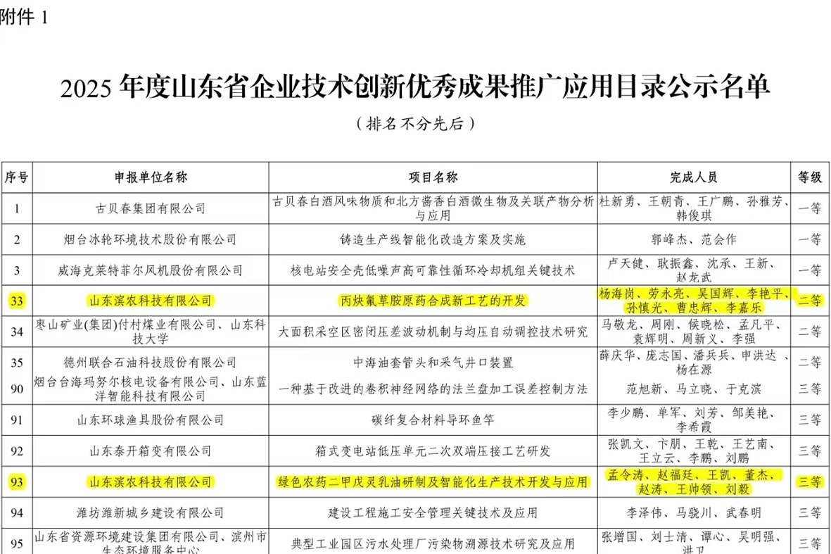 我公司兩項(xiàng)成果斬獲2025年度山東省企業(yè)技術(shù)創(chuàng)新優(yōu)秀成果獎(jiǎng)發(fā)布時(shí)間:2025-10-14 10:52 9月12日,山東省企業(yè)技術(shù)創(chuàng)新促進(jìn)會(huì)正式公布了2025 年度山東省企業(yè)技術(shù)創(chuàng)新優(yōu)秀成果推廣應(yīng)用目錄,我公司憑借在綠色農(nóng)藥研發(fā)與工藝創(chuàng)新領(lǐng)域的突破成果斬獲兩項(xiàng)省級(jí)榮譽(yù)——“丙炔氟草胺原藥合成新工藝的開發(fā)”獲評(píng)二等獎(jiǎng),“綠色農(nóng)藥二甲戊靈乳油研制及智能化生產(chǎn)技術(shù)開發(fā)與應(yīng)用”榮獲三等獎(jiǎng),彰顯了我公司在技術(shù)創(chuàng)新領(lǐng)域的強(qiáng)勁實(shí)力與行業(yè)競(jìng)爭(zhēng)力。 ![]() |