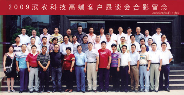 時(shí)間:2012-08-10 14:56秋高氣爽,天氣宜人,2009年9月4日至6日,濱農(nóng)科技董事長黃延昌率銷售公司代表一行人員,與來自全國各地的32位高端客戶相聚在山清水秀的貴陽市,就濱農(nóng)目前存在的問題及未來發(fā)展瓶頸進(jìn)行了廣泛而有益的交流,會議取得了圓滿成功。